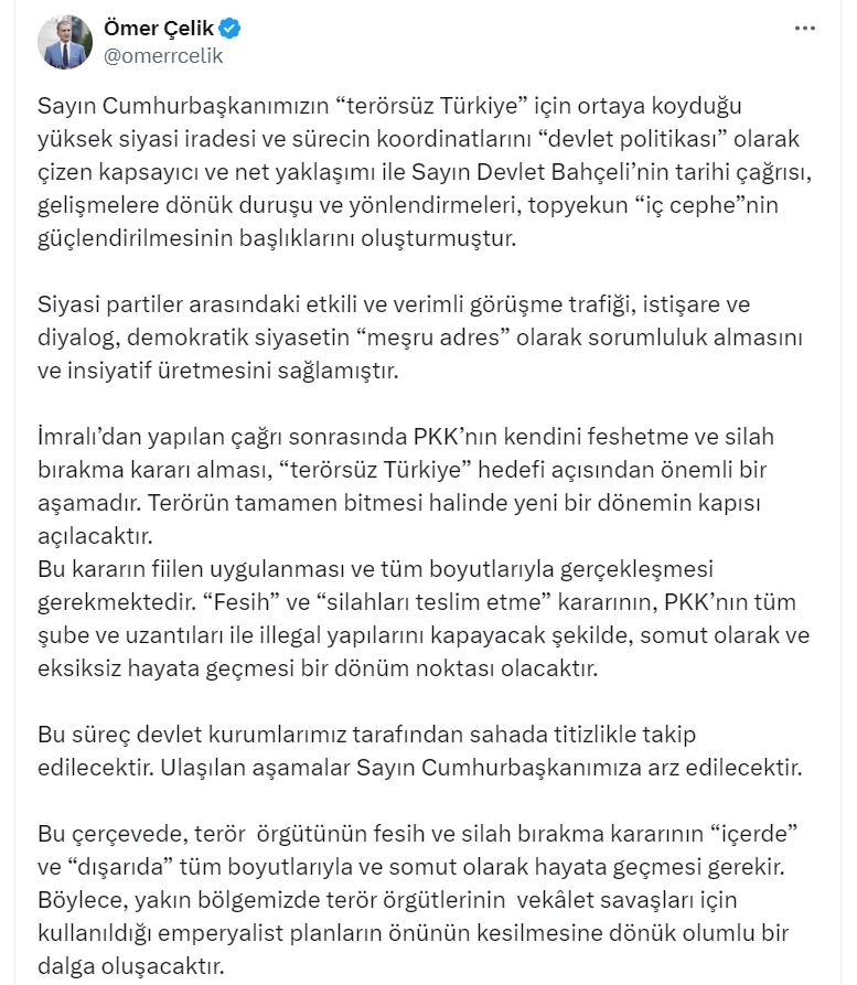 ANKARA, (DHA)- AK Parti Genel Başkan Yardımcısı ve Parti Sözcüsü Ömer Çelik, "PKK'nın kendini feshetme ve silah bırakma kararı alması, 'Terörsüz Türkiye' hedefi açısından önemli bir aşamadır. Bu kararın fiilen uygulanması ve tüm boyutlarıyla gerçekleşmesi gerekmektedir. 'Fesih' ve 'silahları teslim etme' kararının, PKK'nın tüm şube ve uzantıları ile illegal yapılarını kapayacak şekilde, somut olarak ve eksiksiz hayata geçmesi bir dönüm noktası olacaktır" dedi.AK Parti Sözcüsü Çelik, sosyal medya hesabından yaptığı açıklamada, "Sayın Cumhurbaşkanımızın 'Terörsüz Türkiye' için ortaya koyduğu yüksek siyasi iradesi ve sürecin koordinatlarını 'devlet politikası' olarak çizen kapsayıcı ve net yaklaşımı ile Sayın Devlet Bahçeli'nin tarihi çağrısı, gelişmelere dönük duruşu ve yönlendirmeleri, topyekun 'iç cephe'nin güçlendirilmesinin başlıklarını oluşturmuştur. Siyasi partiler arasındaki etkili ve verimli görüşme trafiği, istişare ve diyalog, demokratik siyasetin 'meşru adres' olarak sorumluluk almasını ve inisiyatif üretmesini sağlamıştır. İmralı'dan yapılan çağrı sonrasında PKK'nın kendini feshetme ve silah bırakma kararı alması, 'Terörsüz Türkiye' hedefi açısından önemli bir aşamadır" dedi.'OLUMLU BİR DALGA OLUŞACAK'Terörün tamamen bitmesi halinde yeni bir dönemin kapısının açılacağını kaydeden Çelik, "Bu kararın fiilen uygulanması ve tüm boyutlarıyla gerçekleşmesi gerekmektedir. 'Fesih' ve 'silahları teslim etme' kararının, PKK'nın tüm şube ve uzantıları ile illegal yapılarını kapayacak şekilde, somut olarak ve eksiksiz hayata geçmesi bir dönüm noktası olacaktır. Bu süreç devlet kurumlarımız tarafından sahada titizlikle takip edilecektir. Ulaşılan aşamalar Sayın Cumhurbaşkanımıza arz edilecektir. Bu çerçevede, terör örgütünün fesih ve silah bırakma kararının 'içerde' ve 'dışarıda' tüm boyutlarıyla ve somut olarak hayata geçmesi gerekir. Böylece, yakın bölgemizde terör örgütlerinin vekalet savaşları için kullanıldığı emperyalist planların önünün kesilmesine dönük olumlu bir dalga oluşacaktır. Ayrıca 'Terörsüz Türkiye' hedefine somut olarak ulaşılması, tüm dünyada siyasetin siyasetsizleşmeye boğulduğu bir dönemde, Türkiye'nin siyasi tüm kanalları daha etkili şekilde işletebilmesine imkan verecek, demokrasimizi, siyasi hayatımızı ve milli birliğimizi daha da güçlendirecektir. Siyasi diyalog kanallarının, TBMM başta olmak üzere siyasetin tüm meşru adreslerinde en güçlü şekilde çalışmasını sağlayacaktır" değerlendirmesinde bulundu. 'DEĞERLERİ ZEDELEYECEK HİÇBİR ADIM SÖZ KONUSU DEĞİL'Çelik, ayrıca "Cumhuriyetimizin hepimizin 'çatı'sı olduğu bilinci, demokrasimizin her türlü sorunun çözümü için temel 'zemin' olduğu anlayışı daha güçlenecek ve siyasi olarak kökleşecektir. Tarihdaşlık, kaderdaşlık ve vatandaşlık bilinci ile geleceğimiz en sağlam ve meşru zeminlerde şekillenmeye devam edecektir. Her olumlu aşama yeni bir olumlu aşamanın davetiyesi olacaktır. 'Terörsüz Türkiye'ye sahada tüm boyutlarıyla, eksiksiz ve somut hedefleriyle ulaşılması gerekir. Buna ulaşılması demek, bütün kültürel, etnik ve mezhepsel unsurlarıyla tüm vatandaşlarımızın kazanması demektir. Kazanan tüm vatandaşlarımız olacaktır. Temel prensibimiz şudur; Adlarımız farklı olsa da hepimizin soyadı Türkiye Cumhuriyeti'dir. 'Devletimizin nitelikleri' ve 'milletimizin değerleri' konusunda hiçbir tartışma yoktur, bu değerleri zedeleyecek hiçbir adım söz konusu değildir, olamaz. Cumhurbaşkanımızın ilan ettiği Türkiye Yüzyılı'nı kucaklayacak büyük stratejik adımlardan önde geleni 'Terörsüz Türkiye' olacaktır. Milletimiz müsterih olsun. Türkiye Cumhuriyeti gündemine hakimdir" dedi. (DHA)