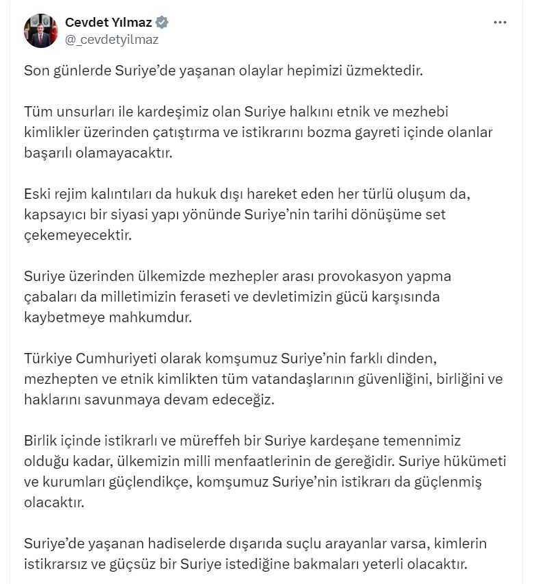 ANKARA, (DHA)- CUMHURBAŞKANI Yardımcısı Cevdet Yılmaz, "Suriye halkını etnik ve mezhebi kimlikler üzerinden çatıştırma ve istikrarını bozma gayreti içinde olanlar başarılı olamayacaktır. Suriye üzerinden ülkemizde mezhepler arası provokasyon yapma çabaları da milletimizin feraseti ve devletimizin gücü karşısında kaybetmeye mahkumdur" dedi.Cevdet Yılmaz, sosyal medya hesabından yaptığı açıklamada, "Son günlerde Suriye'de yaşanan olaylar hepimizi üzmektedir. Tüm unsurları ile kardeşimiz olan Suriye halkını etnik ve mezhebi kimlikler üzerinden çatıştırma ve istikrarını bozma gayreti içinde olanlar başarılı olamayacaktır. Eski rejim kalıntıları da hukuk dışı hareket eden her türlü oluşum da kapsayıcı bir siyasi yapı yönünde Suriye'nin tarihi dönüşüme set çekemeyecektir. Suriye üzerinden ülkemizde mezhepler arası provokasyon yapma çabaları da milletimizin feraseti ve devletimizin gücü karşısında kaybetmeye mahkumdur" ifadelerini kullandı.'HAKLARINI SAVUNMAYA DEVAM EDECEĞİZ'Yılmaz, "Türkiye Cumhuriyeti olarak komşumuz Suriye'nin farklı dinden, mezhepten ve etnik kimlikten tüm vatandaşlarının güvenliğini, birliğini ve haklarını savunmaya devam edeceğiz. Birlik içinde istikrarlı ve müreffeh bir Suriye kardeşane temennimiz olduğu kadar, ülkemizin milli menfaatlerinin de gereğidir. Suriye hükümeti ve kurumları güçlendikçe, komşumuz Suriye'nin istikrarı da güçlenmiş olacaktır. Suriye'de yaşanan hadiselerde dışarıda suçlu arayanlar varsa, kimlerin istikrarsız ve güçsüz bir Suriye istediğine bakmaları yeterli olacaktır" değerlendirmesinde bulundu. (DHA)