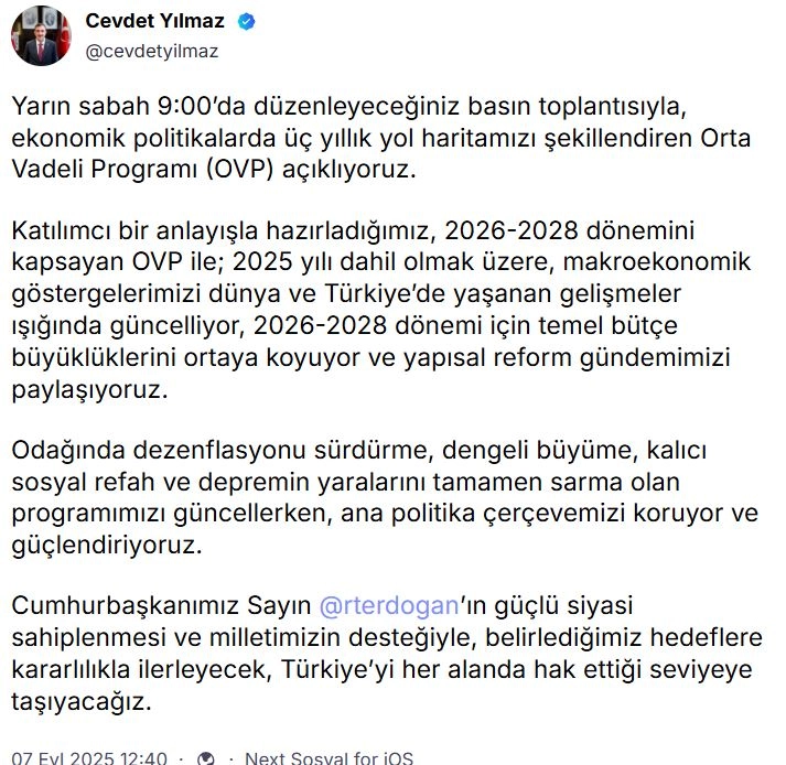 ANKARA, (DHA)- CUMHURBAŞKANI Yardımcısı Cevdet Yılmaz, yarın sabah, ekonomik politikalarda üç yıllık yol haritasını şekillendiren Orta Vadeli Programı (OVP) açıklayacağını duyurdu.Cumhurbaşkanı Yardımcısı Cevdet Yılmaz, NSosyal hesabından yaptığı açıklamada, "Yarın sabah 09.00'da düzenleyeceğimiz basın toplantısıyla, ekonomik politikalarda üç yıllık yol haritamızı şekillendiren Orta Vadeli Programı (OVP) açıklıyoruz. Katılımcı bir anlayışla hazırladığımız, 2026-2028 dönemini kapsayan OVP ile; 2025 yılı dahil olmak üzere, makroekonomik göstergelerimizi dünya ve Türkiye’de yaşanan gelişmeler ışığında güncelliyor, 2026-2028 dönemi için temel bütçe büyüklüklerini ortaya koyuyor ve yapısal reform gündemimizi paylaşıyoruz. Odağında dezenflasyonu sürdürme, dengeli büyüme, kalıcı sosyal refah ve depremin yaralarını tamamen sarma olan programımızı güncellerken, ana politika çerçevemizi koruyor ve güçlendiriyoruz. Cumhurbaşkanımız Sayın Recep Tayyip Erdoğan'ın güçlü siyasi sahiplenmesi ve milletimizin desteğiyle, belirlediğimiz hedeflere kararlılıkla ilerleyecek, Türkiye’yi her alanda hak ettiği seviyeye taşıyacağız" ifadelerini kullandı. (DHA)