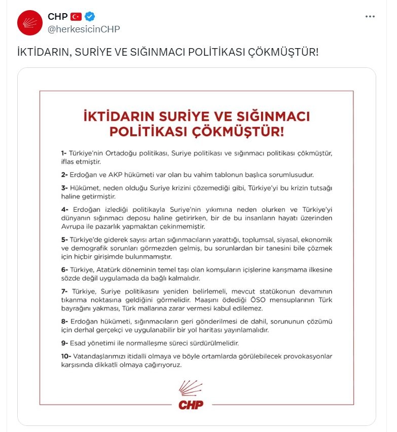 ANKARA, (DHA)-CHP, Kayseri'de 7 yaşındaki bir kız çocuğunun Suriye uyruklu bir kişi tarafından taciz edildiği iddiasıyla başlayan olaylarla ilgili, "Türkiye'nin Ortadoğu politikası, Suriye politikası ve sığınmacı politikası çökmüştür, iflas etmiştir. Erdoğan ve AKP hükümeti var olan bu vahim tablonun başlıca sorumlusudur" açıklamasını yaptı.Partinin sosyal medya hesabından yapılan yazılı açıklamada, "Türkiye'nin Ortadoğu politikası, Suriye politikası ve sığınmacı politikası çökmüştür, iflas etmiştir. Erdoğan ve AKP hükümeti var olan bu vahim tablonun başlıca sorumlusudur. Hükümet, neden olduğu Suriye krizini çözemediği gibi, Türkiye'yi bu krizin tutsağı haline getirmiştir. Erdoğan izlediği politikayla Suriye'nin yıkımına neden olurken ve Türkiye'yi dünyanın sığınmacı deposu haline getirirken, bir de bu insanların hayatı üzerinden Avrupa ile pazarlık yapmaktan çekinmemiştir. Türkiye'de giderek sayısı artan sığınmacıların yarattığı, toplumsal, siyasal, ekonomik ve demografik sorunları görmezden gelmiş, bu sorunlardan bir tanesini bile çözmek için hiçbir girişimde bulunmamıştır" denildi.'TÜRKİYE, SURİYE POLİTİKASINI YENİDEN BELİRLEMELİ'Türkiye'nin, Atatürk döneminin temel taşı olan 'komşuların içişlerine karışmama' ilkesine sözde değil uygulamada da bağlı kalması gerektiği vurgulanarak, "Türkiye, Suriye politikasını yeniden belirlemeli, mevcut statükonun devamının tıkanma noktasına geldiğini görmelidir. Maaşını ödediği ÖSO mensuplarının Türk bayrağını yakması, Türk mallarına zarar vermesi kabul edilemez. Erdoğan hükümeti, sığınmacıların geri gönderilmesi de dahil, sorununun çözümü için derhal gerçekçi ve uygulanabilir bir yol haritası yayımlamalıdır. Esad yönetimi ile normalleşme süreci sürdürülmelidir. Vatandaşlarımızı itidalli olmaya ve böyle ortamlarda görülebilecek provokasyonlar karşısında dikkatli olmaya çağırıyoruz" ifadelerine yer verildi. (DHA)