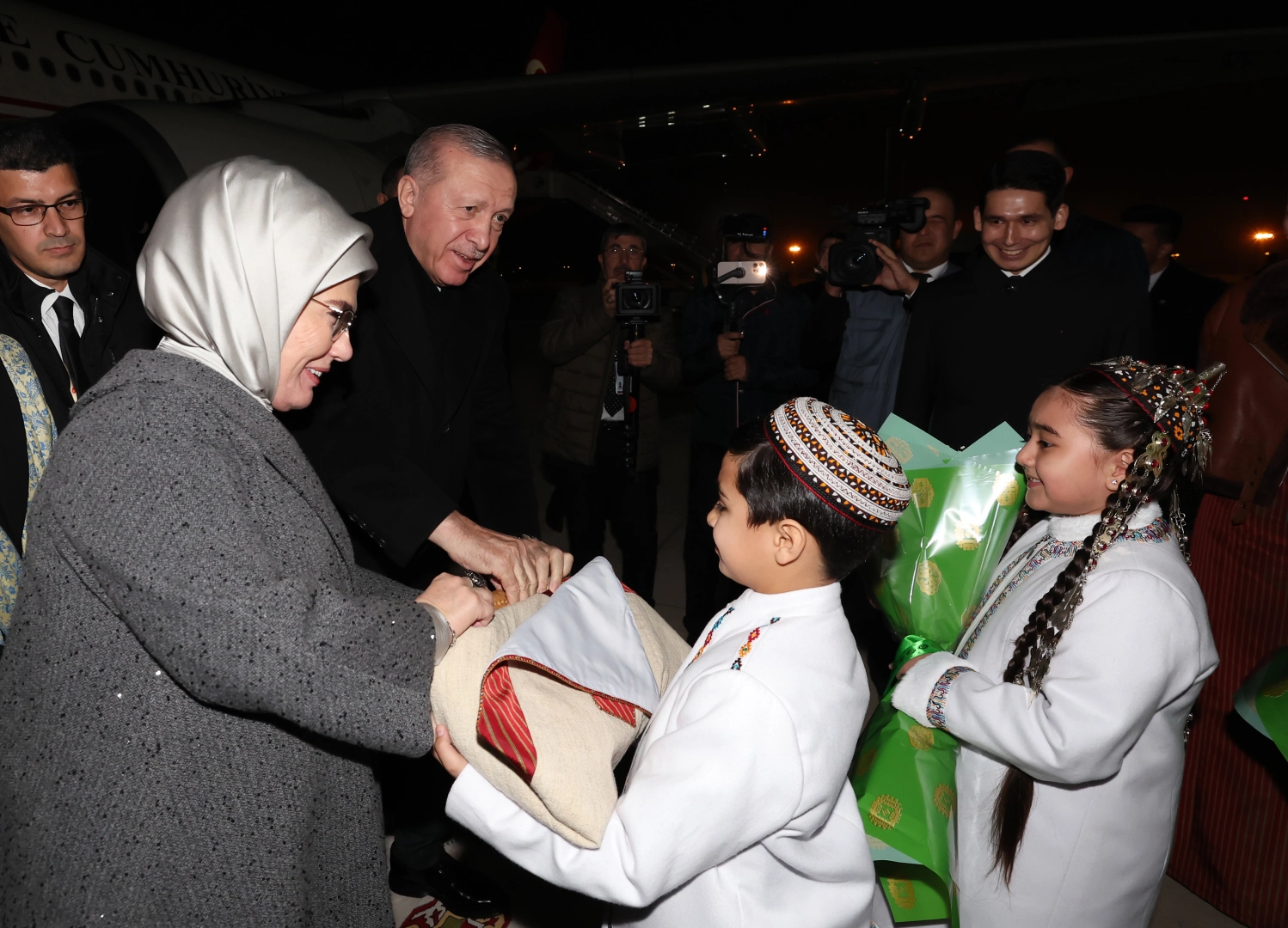 Cumhurbaşkanı Recep Tayyip Erdoğan, 'Uluslararası Barış ve Güven Forumu'na katılmak üzere Türkmenistan'ın başkenti Aşkabat'a geldi. Erdoğan, Aşkabat Uluslararası Havalimanı'nda Türkmenistan Halk Maslahatı Başkanı Gurbanguli Berdimuhamedov, Türkmenistan Bakanlar Kurulu Başkan Yardımcısı Mammethan Çakıyev ve Türkiye'nin Aşkabat Büyükelçisi Ahmet Demirok ile diğer ilgililer tarafından resmi törenle karşılandı. (DHA)