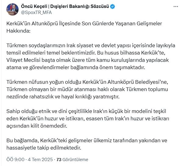 ANKARA, (DHA)- DIŞİŞLERİ Bakanlığı Sözcüsü Öncü Keçeli, Kerkük'te belediyeye Türkmen olmayan müdür atanması ile ilgili, "Türkmen soydaşlarımızın Irak siyaset ve devlet yapısı içerisinde layıkıyla temsil edilmeleri temel beklentimizdir" dedi. Dışişleri Sözcüsü Keçeli, sosyal medya hesabından yaptığı açıklamada, "Türkmen soydaşlarımızın Irak siyaset ve devlet yapısı içerisinde layıkıyla temsil edilmeleri temel beklentimizdir. Bu husus bilhassa Kerkük'te, Vilayet Meclisi başta olmak üzere tüm kamu kuruluşlarında yapılacak atama ve görevlendirmeler bağlamında önem taşımaktadır. Türkmen nüfusun yoğun olduğu Kerkük'ün Altunköprü Belediyesi'ne, Türkmen olmayan bir müdür atanması haklı olarak Türkmen toplumu nezdinde rahatsızlık ve hayal kırıklığı yaratmıştır. Sahip olduğu etnik ve dini çeşitlilikle Irak'ın küçük bir modelini teşkil eden Kerkük'ün huzur ve istikrarı, esasen tüm Irak'ın huzur ve istikrarı açısından kilit önemdedir. Bu bağlamda, Kerkük'teki gelişmeler ülkemiz tarafından yakından ve hassasiyetle takip edilmektedir" dedi. (DHA)