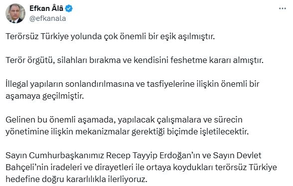 Aliekber METE/ANKARA, (DHA)- AK Parti Genel Başkan Vekili Efkan Ala, "Terörsüz Türkiye yolunda çok önemli bir eşik aşılmıştır. Terör örgütü, silahları bırakma ve kendisini feshetme kararı almıştır. İllegal yapıların sonlandırılmasına ve tasfiyelerine ilişkin önemli bir aşamaya geçilmiştir" dedi.AK Parti Genel Başkan Vekili ve Bursa Milletvekili Efkan Ala, terör örgütü PKK'nın silah bırakma ve fesih kararı ile ilgili sosyal medya hesabından açıklama yaptı. Ala, "Terörsüz Türkiye yolunda çok önemli bir eşik aşılmıştır. Terör örgütü, silahları bırakma ve kendisini feshetme kararı almıştır. İllegal yapıların sonlandırılmasına ve tasfiyelerine ilişkin önemli bir aşamaya geçilmiştir. Gelinen bu önemli aşamada, yapılacak çalışmalara ve sürecin yönetimine ilişkin mekanizmalar gerektiği biçimde işletilecektir. Sayın Cumhurbaşkanımız Recep Tayyip Erdoğan’ın ve Sayın Devlet Bahçeli’nin iradeleri ve dirayetleri ile ortaya koydukları 'Terörsüz Türkiye' hedefine doğru kararlılıkla ilerliyoruz" ifadelerini kullandı. (DHA)