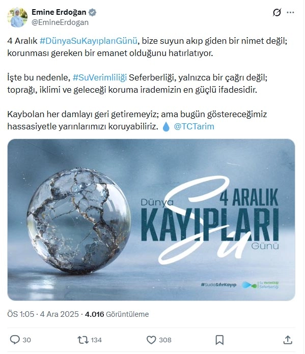 Emine Erdoğan, sosyal medya hesabından yaptığı paylaşımda, "4 Aralık Dünya Su Kayıpları Günü, bize suyun akıp giden bir nimet değil; korunması gereken bir emanet olduğunu hatırlatıyor. İşte bu nedenle, su verimliliği seferberliği, yalnızca bir çağrı değil; toprağı, iklimi ve geleceği koruma irademizin en güçlü ifadesidir. Kaybolan her damlayı geri getiremeyiz; ama bugün göstereceğimiz hassasiyetle yarınlarımızı koruyabiliriz" ifadelerini kullandı. (DHA)