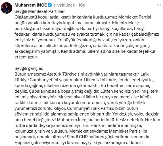 ANKARA, (DHA)- MEMLEKET Partisi, bugün gerçekleştirilen 2'nci Olağanüstü Kurultay'da alınan kararla oy çokluğuyla kapatıldı. Memleket Partisi kurucusu ve eski Genel Başkanı Muharrem İnce, “Memleket sevdamız Memleket Partisi ile başlamadı, onunla bitmez! Şimdi CHP saflarını güçlendirme zamanıdır. Yol değişir, yolcu değişir ama hedef değişmez” dedi.Memleket Partisi kurucusu ve eski Genel Başkanı Muharrem İnce, kurultay sonrası sosyal medya hesabından yaptığı açıklamada, "Olağanüstü koşullarda, kısıtlı imkanlarla kurduğumuz Memleket Partisi bugün yapılan kurultayla kapatılma kararı almıştır. Kiminizdeki iç burukluğunu hissetmiyor değilim. Bu partiyi hangi koşullarda, hangi fedakarlıklarla kurduğumuzu ve ayakta tutmak için ne kadar çabaladığımızı en iyi siz biliyorsunuz. En büyük fedakarlığı bez afişleri yazan, onları köprülere asan, elinde hoparlörle gezen, sabahlara kadar çalışan genç arkadaşlarım yapmıştır. Kendi adıma, ülkem adına size ne kadar teşekkür etsem azdır. Sevgili gençler, Bütün amacımız Atatürk Türkiye'sini aydınlık yarınlara taşımaktır. Laik Türkiye Cumhuriyeti’ni yaşatmaktır. Ülkemizi bilimde, fende, edebiyatta, sporda çağdaş ülkelerin üzerine çıkarmaktır. Bu hedeften zerre sapmış değiliz. Çabalarınız asla boşa gitmiş değildir. Lütfen kendinizi yenilmiş, terk edilmiş hissetmeyiniz. Mevcut siyasi iklim bir araya gelmemizi ve küçük farklılıklarımızı bir kenara koyarak omuz omuza, yürek yüreğe birlikte yürümemizi zorunlu kılıyor. Cumhuriyet Halk Partisi, bizim bütün söylemlerimizi iddialarımızı sahiplenen bir partidir. Yol değişir, yolcu değişir ama hedef değişmez! Muharrem İnce, bu hedefin rütbesiz neferidir. Her kim rütbe derdindeyse yanımızdan ayrılsın. Her kim hedefe inanmışsa, kolumuza girsin ve yürüsün. Memleket sevdamız Memleket Partisi ile başlamadı, onunla bitmez! Şimdi CHP saflarını güçlendirme zamanıdır. Hepinizi çok seviyorum, iyi ki varsınız, iyi ki yol arkadaşım oldunuz" ifadelerini kullandı. (DHA)