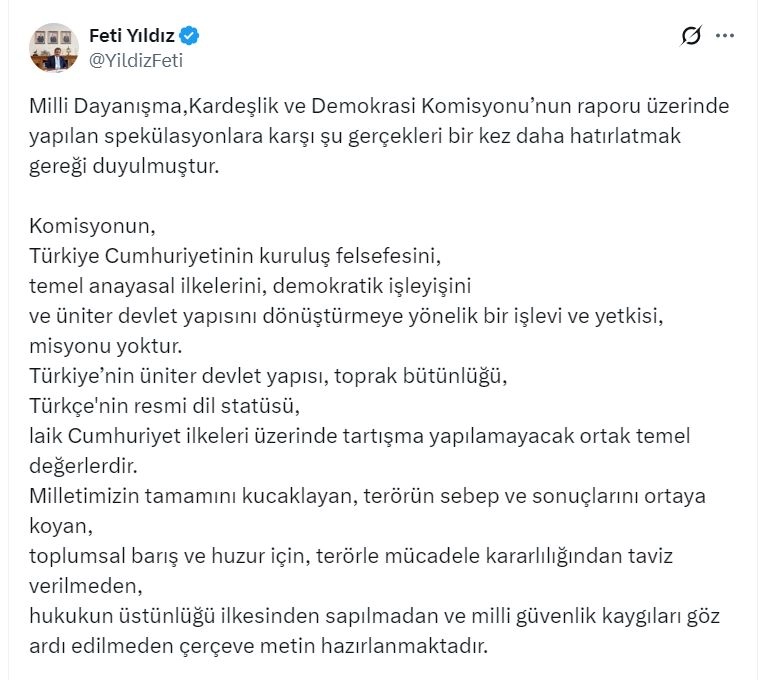 MHP'li Yıldız, sanal medya hesabından yaptığı açıklamada, "Milli Dayanışma, Kardeşlik ve Demokrasi Komisyonu'nun raporu üzerinde yapılan spekülasyonlara karşı şu gerçekleri bir kez daha hatırlatmak gereği duyulmuştur. Komisyonun, Türkiye Cumhuriyeti'nin kuruluş felsefesini, temel anayasal ilkelerini, demokratik işleyişini ve üniter devlet yapısını dönüştürmeye yönelik bir işlevi ve yetkisi, misyonu yoktur. Türkiye'nin üniter devlet yapısı, toprak bütünlüğü, Türkçe'nin resmi dil statüsü, laik Cumhuriyet ilkeleri üzerinde tartışma yapılamayacak ortak temel değerlerdir. Milletimizin tamamını kucaklayan, terörün sebep ve sonuçlarını ortaya koyan, toplumsal barış ve huzur için, terörle mücadele kararlılığından taviz verilmeden, hukukun üstünlüğü ilkesinden sapılmadan ve milli güvenlik kaygıları göz ardı edilmeden çerçeve metin hazırlanmaktadır" dedi. (DHA)