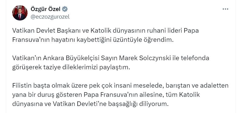 ANKARA, (DHA)- CHP Genel Başkanı Özgür Özel, Vatikan Devlet Başkanı Papa Fransuva'nın yaşamını yitirmesi nedeniyle taziye mesajı paylaştı.Özgür Özel, sosyal medya hesabından yayımladığı mesajda, "Vatikan Devlet Başkanı ve Katolik dünyasının ruhani lideri Papa Fransuva’nın hayatını kaybettiğini üzüntüyle öğrendim. Vatikan’ın Ankara Büyükelçisi Sayın Marek Solczynski ile telefonda görüşerek taziye dileklerimizi paylaştım. Filistin başta olmak üzere pek çok insani meselede, barıştan ve adaletten yana bir duruş gösteren Papa Fransuva'nın ailesine, tüm Katolik dünyasına ve Vatikan Devleti'ne başsağlığı diliyorum" dedi. (DHA)