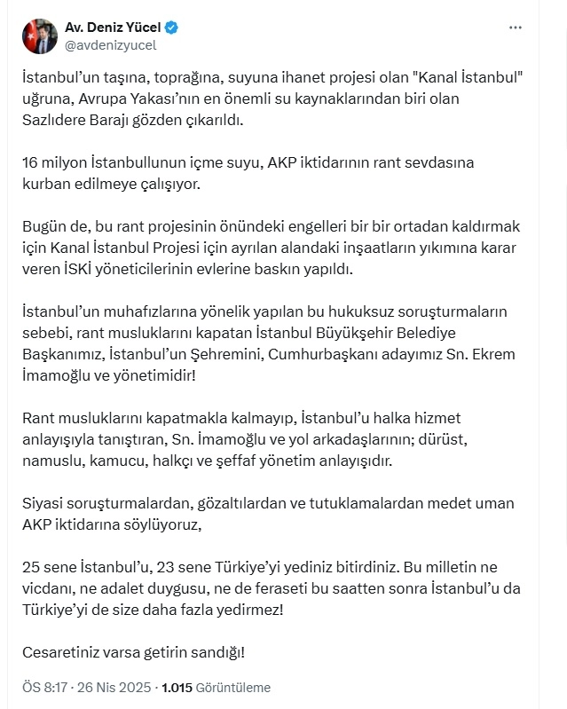 ANKARA, (DHA)- CUMHURİYET Halk Partisi (CHP) Sözcüsü Deniz Yücel, “İstanbul’un taşına, toprağına, suyuna ihanet projesi olan ‘Kanal İstanbul’ uğruna, Avrupa Yakası’nın en önemli su kaynaklarından biri olan Sazlıdere Barajı gözden çıkarıldı” açıklamasında bulundu. CHP sözcüsü Deniz Yücel, sosyal medya hesabından paylaşım yaparak, “İstanbul’un taşına, toprağına, suyuna ihanet projesi olan ‘Kanal İstanbul’ uğruna, Avrupa Yakası’nın en önemli su kaynaklarından biri olan Sazlıdere Barajı gözden çıkarıldı. 16 milyon İstanbullunun içme suyu, AKP iktidarının rant sevdasına kurban edilmeye çalışıyor. Bugün de, bu rant projesinin önündeki engelleri bir bir ortadan kaldırmak için Kanal İstanbul Projesi için ayrılan alandaki inşaatların yıkımına karar veren İSKİ yöneticilerinin evlerine baskın yapıldı. İstanbul’un muhafızlarına yönelik yapılan bu hukuksuz soruşturmaların sebebi, rant musluklarını kapatan İstanbul Büyükşehir Belediye Başkanımız, İstanbul’un Şehremini, Cumhurbaşkanı adayımız Sn. Ekrem İmamoğlu ve yönetimidir. Rant musluklarını kapatmakla kalmayıp, İstanbul’u halka hizmet anlayışıyla tanıştıran, Sn. İmamoğlu ve yol arkadaşlarının; dürüst, namuslu, kamucu, halkçı ve şeffaf yönetim anlayışıdır. Siyasi soruşturmalardan, gözaltılardan ve tutuklamalardan medet uman AKP iktidarına söylüyoruz, 25 sene İstanbul’u, 23 sene Türkiye’yi yediniz bitirdiniz. Bu milletin ne vicdanı, ne adalet duygusu, ne de feraseti bu saatten sonra İstanbul’u da Türkiye’yi de size daha fazla yedirmez. Cesaretiniz varsa getirin sandığı!” ifadelerini kullandı. (DHA)
