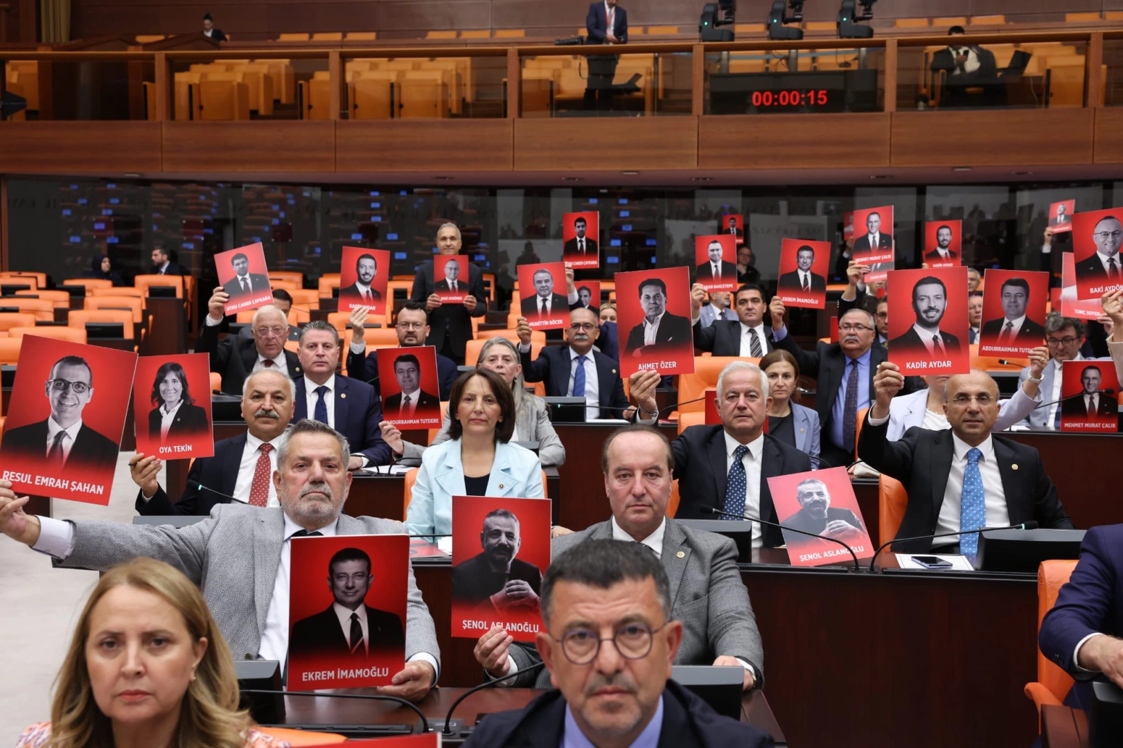 Aliekber METE/ ANKARA, (DHA)- TBMM Genel Kurulu'nda CHP'li milletvekilleri, Adana Büyükşehir Belediyesi, Antalya Büyükşehir Belediyesi ile Adıyaman Belediyesine düzenlenen operasyonları ve belediye başkanlarının tutuklanmasını protesto etti.TBMM Genel Kurulu, 'Bazı Kanunlarda ve 375 Sayılı Kanun Hükmünde Kararnamede Değişiklik Yapılmasına Dair Kanun Teklifi'ni görüşmek üzere Meclis Başkanvekili Bekir Bozdağ başkanlığında toplandı.'DEMOKRASİMİZ BÜYÜK BİR TEHDİT ALTINDA'Genel Kurul'da CHP'li vekilleri grup sıralarına İstanbul Büyükşehir Belediye Başkanı Ekrem İmamoğlu, Adana Büyükşehir Belediye Başkanı Zeydan Karalar, Antalya Büyükşehir Belediye Başkanı Muhittin Böcek, Adıyaman Belediye Başkanı Abdurrahman Tutdere başta olmak üzere operasyonlarda tutuklanan belediye başkanlarının fotoğraflarını koydu. Ardından gündem dışı konuşmalar bölümünde söz alan CHP Grup Başkanvekili Ali Mahir Başarır, "Ülkemiz, demokrasimiz büyük bir tehdit altında. Üzülerek söylemek isterim ki bugün seçilmiş bir milletvekili, 14 belediye başkanı, sanatçılar, gençler, sendikacılar cezaevinde, 30 milyon yurttaşımızın iradesi kelepçede cezaevinde. Demokrasimiz, muhalefet yok edilmek isteniyor. Bakın, 'Vesayet, darbe; bununla mücadele edeceğim' diyen bir iktidar maalesef ki 80 darbesini aratır oldu. 1980'de darbe yapıldığında bütün belediye başkanları görevden alındı, albaylar, yarbaylar atandı ama Evren döneminde bile bir tane belediye başkanı tutuklanmadı arkadaşlar, döneminizde bunlar yapıldı. Üzülerek söylüyorum; adalet sarayları ile Cumhurbaşkanı sarayları aynı işleve sahip bugün. Üzülerek söylüyorum; cumhuriyet başsavcıları ile sarayın iletişim başkanları aynı işleve sahip bugün. Bugün bu ülkede valiler ile AKP il başkanları aynı koltuğu paylaşıyor. Devletleşen bir parti, partileşen bir devlet görüyoruz" ifadelerini kullandı. Başarır'ın konuşmasının ardından CHP'li milletvekilleri yerlerinden kalktı ve ellerindeki fotoğrafları kaldırarak, 'Hak, hukuk, adalet' sloganları attı. GENEL KURUL GÖRÜŞMELERİ SÜRÜYORGenel Kurul'da siyasi partilerin TBMM Başkanlığına sunduğu araştırma önergelerinin görüşülmesinin ardından kanun teklifinin tümü üzerinde görüşmeler sürüyor. (DHA)