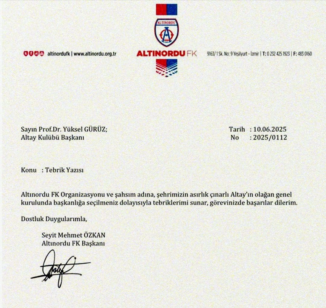 İZMİR, (DHA)- İZMİR'in köklü kulüplerinden Altınordu'nun Başkanı Seyit Mehmet Özkan, 28 Mayıs'ta yapılan genel kurulda göreve gelen Altay Başkanı Prof. Dr. Yüksel Gürüz'e tebrik mesajı yolladı. Altınordu Başkanı Özkan yazılı mesajında, "Altınordu FK organizasyonu ve şahsım adına şehrimizin asırlık çınarı Altay'ın olağan genel kurulunda başkanlığa seçilmeniz dolayısıyla tebriklerimi sunar, görevinizde başarılar dilerim. Dostluk duygularımla, Altınordu FK Başkanı Seyit Mehmet Özkan" diye konuştu.Siyah-beyazlı kulüpten yapılan açıklamada ise şu ifadelere yer verildi: "Altay Spor Kulübü olarak, Başkanımız Sayın Yüksel Gürüz'ün göreve seçilmesi dolayısıyla ilettikleri nazik tebrik mesajı için Dost ve Kardeş Kulübümüz Altınordu A.Ş. Başkanı ve değerli yönetim kurulu üyelerine içten teşekkürlerimizi sunarız. Türk futboluna değer katan Altınordu Kulübü’nün başarılarının artarak devam etmesini diler, iki köklü camia arasındaki dostluk ve dayanışmanın her zaman süreceğine olan inancımızı vurgulamak isteriz."İBRA KONGRESİ İÇİN YARIN TOPLANTI YAPILACAKAltay'da eski başkan Özgür Ekmekçioğlu ve yönetimi için yapılacak ibra kongresi öncesi kulüpten Altaylı hukukçulara çağrı geldi. Siyah-beyazlıların yarın kulüp tesislerinde bir araya gelip toplantı yapacağı bildirildi. Açıklamada, "28.05.2025 tarihinde yapılan olağan seçimli genel kuruldaki gündemin 5'inci maddesinde yer alan ve genel kurulca alınan karar gereğince kulübümüze üye olan hukukçuların katılımı ile 11.06.2025 Çarşamba günü saat 17.00'de Gaziemir'de bulunan kulüp binamızda toplantı düzenlenecektir. Söz konusu toplantıya hukuk fakültesi mezunu genel kurul üyelerinin katılmasını rica ederiz" denildi.(FOTOĞRAFLI)