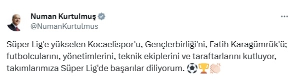 ANKARA, (DHA)- TÜRKİYE Büyük Millet Meclisi (TBMM) Başkanı Numan Kurtulmuş, Süper Lig'e yükselen Kocaelispor, Gençlerbirliği ve Fatih Karagümrük'ü yayımladığı mesajla tebrik etti.TBMM Başkanı Numan Kurtulmuş, sosyal medya hesabından paylaştığı mesajında, "Süper Lig'e yükselen Kocaelispor'u, Gençlerbirliği'ni, Fatih Karagümrük'ü; futbolcularını, yönetimlerini, teknik ekiplerini ve taraftarlarını kutluyor, takımlarımıza Süper Lig'de başarılar diliyorum" dedi. (DHA)