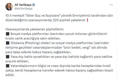 ANKARA, (DHA)- İÇİŞLERİ Bakanı Ali Yerlikaya, siber suç ve suçlulara yönelik 10 il merkezli 31 ilde düzenlenen operasyonlarda 223 şüphelinin yakalandığını duyurdu.Bakan Yerlikaya, sosyal medya hesabından yaptığı açıklamada, cumhuriyet başsavcılıkları ile Emniyet Genel Müdürlüğü Siber Suçlarla Mücadele Daire Başkanlığı koordinesinde, dün siber suç ve suçlulara yönelik 10 il merkezli 31 ilde düzenlenen operasyonlarda 223 şüphelinin yakalandığını belirtti. Yerlikaya, "Operasyonlarda yakalanan şüphelilerin; sosyal medya platformları üzerinden çocuk istismarı görüntülerini kripto varlık aracılığıyla satın aldıkları, oltalama (phishing) siteleri ve sosyal medya platformları üzerinden iletişime geçtikleri vatandaşlarımızdan 'ürün bedeli, vergi' adı altında para talep ederek haksız kazanç sağladıkları, yasa dışı bahis oynattıkları ve yasa dışı bahisle bağlantılı para nakline aracılık ettikleri, vatandaşlarımızın bilgisi ve rızası dışında banka hesaplarından kredi çekip, kendi hesaplarına transfer ederek haksız kazanç sağladıkları tespit edildi" dedi.'SANAL DEVRİYELERİMİZ 7/24 GÖREVLERİNİN BAŞINDA'Şüpheliler hakkında; bilişim sistemlerinin kullanılması suretiyle nitelikli dolandırıcılık, yasa dışı bahis, çevrim içi çocuk müstehcenliği ve tacizi, nitelikli hırsızlık suçlarından soruşturma başlatıldığını kaydeden Yerlikaya, "Operasyonlar sonucu çok sayıda dijital materyale el konuldu. Valilerimizi, operasyonları koordine eden cumhuriyet başsavcılıklarımızı, MASAK'ımızı operasyonları gerçekleştiren kahraman polislerimizi tebrik ediyorum. Siber Vatan’da sanal devriyelerimiz 7 gün 24 saat görevlerinin başında. Siber suçlar ve suçlularla mücadelemiz aralıksız devam ediyor" açıklamasında bulundu. (DHA)