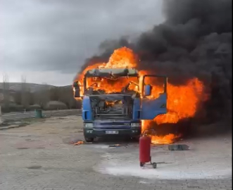 Hüsnü Ümit AVCI/SİVAS, (DHA)- SİVAS'ın Gürün ilçesinde, dinlenme tesisinde park halindeki TIR motor kısmından alev alıp, yandı. TIR'ın şoförü Mustafa Dinç, yangına müdahale etmek isterken hafif yaralandı.Gürün ilçesi yakınlarındaki dinlenme tesisinde saat 09.00 sıralarında yangın çıktı. Mustafa Dinç'e ait 71 FA 995 plakalı TIR, park halindeyken motor bölümünden alev aldı. Büyüyen alevler TIR'ın tamamını sardı. Çevredekilerin ihbarıyla adrese Büyükşehir Belediyesi Darende İlçe İtfaiye Amirliği ve Gürün İtfaiyesi ve sağlık ekipleri sevk edildi. Ekiplerin yaklaşık yarım saat süren çalışmasının ardından yangın söndürüldü. TIR'ın kullanılamaz hale geldiği yangına müdahale ederken hafif yaralanan şoför Mustafa Dinç'e ambulansta müdahale edildi. Yangın sırasında Dinç, “Anam öleyim ben, kurban olayım, yetişin” diyerek ağladı. Yangına ilişkin soruşturma başlatıldı. (DHA)