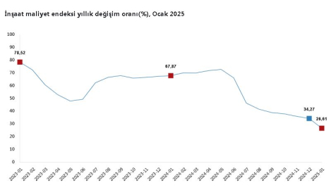 ANKARA, (DHA)- TÜRKİYE İstatistik Kurumu (TÜİK), ocak ayında inşaat maliyet endeksinin yıllık yüzde 26,61, aylık yüzde 9,10 arttığını açıkladı.TÜİK, Ocak 2025 dönemine ilişkin inşaat maliyet endeksi verilerini açıkladı. Buna göre; inşaat maliyet endeksi, 2025 yılı Ocak ayında bir önceki aya göre yüzde 9,10 arttı, bir önceki yılın aynı ayına göre yüzde 26,61 arttı. Bir önceki aya göre malzeme endeksi yüzde 1,96 arttı, işçilik endeksi yüzde 23,58 arttı. Ayrıca bir önceki yılın aynı ayına göre malzeme endeksi yüzde 22,39 arttı, işçilik endeksi yüzde 34,37 arttı. Bina inşaatı maliyet endeksi, bir önceki aya göre yüzde 9,39 arttı, bir önceki yılın aynı ayına göre yüzde 27,09 arttı. Bina dışı yapılar için inşaat maliyet endeksi, bir önceki aya göre yüzde 8,13 arttı, bir önceki yılın aynı ayına göre yüzde 25,05 arttı. (DHA)