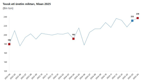 ANKARA, (DHA)- TÜRKİYE İstatistik Kurumu (TÜİK), nisanda aylık tavuk eti üretiminin arttığını, yumurta ve içme sütü üretiminin azaldığını açıkladı. TÜİK, Nisan 2025 dönemine ilişkin kümes hayvancılığı ile süt ve süt ürünleri üretim istatistiklerini açıkladı. Buna göre; bir önceki ay 231 bin 595 ton olan tavuk eti üretimi, nisan ayında yüzde 2,6 oranında artarak 237 bin 567 ton oldu. Bir önceki ay 1 milyar 632 milyon 774 bin adet olan tavuk yumurtası üretimi de nisan ayında yüzde 5 oranında azalarak 1 milyar 551 milyon 765 bin adet oldu. Bir önceki yılın aynı ayına göre, tavuk yumurtası üretimi yüzde 9,1 azaldı, kesilen tavuk sayısı yüzde 20,7 arttı, tavuk eti üretimi yüzde 23,5 arttı. Ocak-Nisan döneminde bir önceki yılın aynı dönemine göre, tavuk yumurtası üretimi yüzde 9,7 azaldı, kesilen tavuk sayısı yüzde 11,5 arttı, tavuk eti üretimi yüzde 14,8 arttı.981 BİN 10 TON İNEK SÜTÜ TOPLANDIBir önceki ay 1 milyon 15 bin 647 ton olan ticari süt işletmelerince toplanan inek sütü miktarı, nisan ayında yüzde 3,4 oranında azalarak 981 bin 10 ton oldu. Bir önceki ay 148 bin 525 ton olan içme sütü üretimi de nisan ayında yüzde 3,8 oranında azalarak 142 bin 948 ton olarak gerçekleşti. Ticari süt işletmeleri tarafından toplanan inek sütü miktarı, nisan ayında bir önceki yılın aynı ayına göre yüzde 1,6 arttı, ocak-nisan döneminde ise bir önceki yılın aynı dönemine göre yüzde 1,5 arttı. Nisan ayında bir önceki yılın aynı ayına göre, inek peyniri üretimi yüzde 4,8 arttı, ayran ve kefir üretimi yüzde 9,4 arttı, yoğurt üretimi yüzde 5,8 arttı, içme sütü üretimi yüzde 7,9 arttı, tereyağı ve sadeyağ üretimi yüzde 24,1 arttı. Ocak-nisan döneminde ise bir önceki yılın aynı dönemine göre, inek peyniri üretimi yüzde 0,8 arttı, ayran ve kefir üretimi yüzde 5,3 arttı, yoğurt üretimi yüzde 3 arttı, içme sütü üretimi yüzde 2,7 arttı, tereyağı ve sadeyağ üretimi yüzde 6,8 arttı. (DHA)
