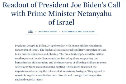 Biden-Netanyahu görüşmesine ililşkin Beyaz Saray’dan yapılan açıklamada, “Başkan Biden, İsrail Başbakanı Benjamin Netanyahu ile görüştü. Liderler İsrail'in Gazze'deki askeri harekâtını, hedefleri ve aşamaları dâhil olmak üzere ele aldı. Başkan, insani yardım operasyonuna destek verenler de dâhil olmak üzere sivil halkın korunmasının kritik önem taşıdığını ve sivillerin çatışmaların devam ettiği bölgelerden güvenli bir şekilde uzaklaşmalarına izin verilmesinin önemini vurguladı. Liderler kalan tüm rehinelerin serbest bırakılmasının önemini ele aldılar. Hem doğrudan hem de kendi ulusal güvenlik ekipleri aracılığıyla düzenli istişarelerde bulunmaya devam etme konusunda mutabık kalmışlardır” denildi.