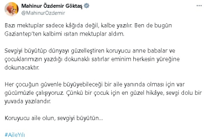 ANKARA, (DHA)- Aile ve Sosyal Hizmetler Bakanı Mahinur Özdemir Göktaş, koruyucu aileler ve çocuklardan gelen mektupların yer aldığı videoyu paylaşarak, "Koruyucu aile olun, sevgiyi büyütün" dedi.Bakan Göktaş, Gaziantep'teki koruyucu aileler ve çocuklardan gelen mektupların yer aldığı videoyu sosyal medya hesabından paylaştı. Göktaş, paylaşımında, "Bazı mektuplar sadece kağıda değil, kalbe yazılır. Ben de bugün Gaziantep’ten kalbimi ısıtan mektuplar aldım. Sevgiyi büyütüp dünyayı güzelleştiren koruyucu anne babalar ve çocuklarımızın yazdığı dokunaklı satırlar eminim herkesin yüreğine dokunacaktır. Her çocuğun güvenle büyüyebileceği bir aile yanında olması için var gücümüzle çalışıyoruz. Çünkü bir çocuk için en güzel hikaye, sevgi dolu bir yuvada yazılandır. Koruyucu aile olun, sevgiyi büyütün" dedi. (DHA)