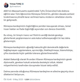 Bakan Tunç: Rümeysa'nın serbest bırakılması kamu vicdanını rahatlatmıştır