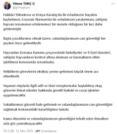ANKARA, (DHA)- ADALET Bakanı Yılmaz Tunç, sahipsiz hayvanlarının kontrol altına alınması ve barınakların etkin işletilmesi konusunda görevini ihmal edenler hakkında gerekli hukuki ve cezai işlemlerin uygulanacağını açıkladı.Adalet Bakanı Yılmaz Tunç, sosyal medya hesabından yaptığı açıklamada, "Hakkari Yüksekova ve Konya Karatay'da iki evladımızın hayatını kaybetmesi, Erzurum Narman'da bir evladımızın yaralanması, sahipsiz hayvan sorununun ertelenemez bir mesele olduğunu bir kez daha göstermiştir. Başta çocuklarımız olmak üzere, vatandaşlarımızın can güvenliği her şeyden önce gelmektedir. Hayvanları Koruma Kanunu çerçevesinde belediyeler ve il özel idareleri, sahipsiz hayvanların kontrol altına alınması ve barınakların etkin işletilmesi konusunda sorumludur. Yetkililerin görevlerini eksiksiz yerine getirmesi büyük önem arz etmektedir" dedi. 'İHMALLERE ASLA GÖZ YUMULMAYACAKTIR'Yaşanan olaylarla ilgili adli ve idari soruşturmaların başlatıldığını anımsatan Tunç, "Görevini ihmal edenler hakkında gerekli hukuki ve cezai işlemler uygulanacaktır. Sokaklarımızı güvenli hale getirmek ve vatandaşlarımızın can güvenliğini sağlamak konusundaki kararlılığımız tamdır. Kamu düzenini ve vatandaşlarımızın güvenliğini tehdit eden ihmallere asla göz yumulmayacaktır" açıklamasında bulundu. (DHA)