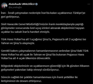 ANKARA, (DHA)- ULAŞTIRMA ve Altyapı Bakanı Abdulkadir Uraloğlu, "İran-İsrail çatışmaları nedeniyle İran’da kalan uçaklarımızı Türkiye’ye geri getiriyoruz. Gerekli bakım çalışmalarının tamamlanmasının ardından Şiraz’daki Türk Hava Yolları’na ait uçak ile Tahran ve Şiraz’da bulunan Pegasus Hava Yolları’na ait 4 uçak ülkemize dönecektir" dedi.Bakan Uraloğlu, sosyal medya hesabından yaptığı açıklamada, "İran’da kalan uçaklarımızı Türkiye’ye geri getiriyoruz. Sivil Havacılık Genel Müdürlüğü'müzün İranlı mevkidaşlarıyla yaptığı görüşmeler sonucunda özel uçuş izinleri alınarak ekiplerimizi taşıyan uçaklar bu sabah İran’a hareket etmiştir. Türk Hava Yolları’na ait 1 uçağımız Şiraz’a, Pegasus’a ait 2 uçağımız ise Tahran ve Şiraz’a ulaşmıştır. Gerekli bakım çalışmalarının tamamlanmasının ardından Şiraz’daki Türk Hava Yolları’na ait uçak ile Tahran ve Şiraz’da bulunan Pegasus Hava Yolları’na ait 4 uçak ülkemize dönecektir. Bölgedeki ekiplerimizin ve uçaklarımızın güvenliği için ilk günden itibaren gelişmeleri yakından takip etmeyi sürdürüyoruz. Sürecin sağlıklı bir şekilde tamamlanması için İranlı yetkililer ile iletişimimizi de devam ettiriyoruz” ifadelerini kullandı. (DHA)