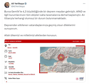 BAKAN YERLİKAYA: AN İTİBARIYLA OLUMSUZ DURUM YOKİçişleri Bakanı Ali Yerlikaya, depreme ilişkin sosyal medya hesabından açıklama yaptı. Yerlikaya, "Bursa Gemlik'te 4,3 büyüklüğünde bir deprem meydan gelmiştir. AFAD ve ilgili kurumlarımızın tüm ekipleri saha taramalarına derhal başlamıştır. An itibarıyla herhangi olumsuz bir durum bulunmamaktadır. Depremden etkilenen vatandaşlarımıza geçmiş olsun dileklerimi sunuyorum. Allah ülkemizi ve milletimizi afetlerden korusun" dedi. (DHA)