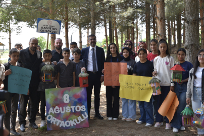 Öğrenciler, atık malzemelerden yaptıkları kuş yuvalarını 'Millet Bahçesi'ndeki ağaçlara astı