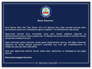 ‘ÖĞRENCİLER VE ÖĞRETMENLERE KORUYUCU TEDAVİ UYGULANDI’Kocaeli Valiliği, İrem Aslan’ın ölümüne ilişkin yazılı açıklamada yaptı. Açıklamada, Aslan’ın, menenjit tanısıyla tedavi görürken hayatını kaybettiği belirtilerek, “Öğrencimize menenjit tanısı konulduktan sonra yakın temaslı olabilecek öğrenciler ve öğretmenlerimize koruyucu tedavi uygulanmıştır. An itibariyle söz konusu okulda ve civarında menenjit semptomlarına rastlanılmamıştır. Sağlık Müdürlüğü ekipleri tarafından okulda gerekli bilgilendirmeler yapılmış, Milli Eğitim Müdürlüğü ekiplerimiz de okulda rehberlik görevlerini yürütmekte olup konu ilgili müdürlüklerimizce ve valiliğimizce yakından takip edilmektedir. Vefat eden öğrencimize Allah’tan rahmet, kederli ailesi, öğretmenleri ve arkadaşlarına baş sağlığı diliyoruz” ifadelerine yer verildi. (DHA)