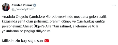 CUMHURBAŞKANI YARDIMCISI YILMAZ'DAN TAZİYE MESAJICumhurbaşkanı Yardımcısı Cevdet Yılmaz, sosyal medya hesabından taziye mesajı paylaştı. Cevdet Yılmaz, "Anadolu Otoyolu Çamlıdere-Gerede mevkinde meydana gelen trafik kazasında şehit olan polisimiz İbrahim Güney ve Cumhurbaşkanlığı personelimiz Ahmet Ülger'e Allah’tan rahmet, ailelerine ve tüm yakınlarına başsağlığı diliyorum. Milletimizin başı sağ olsun" ifadelerini kullandı. (DHA)