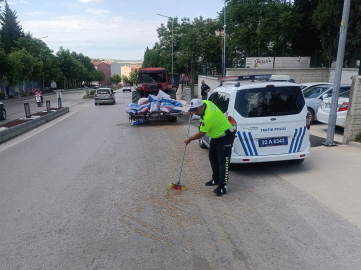 Ünsal YÜCEL/EDİRNE, (DHA)- EDİRNE’nin Keşan ilçesinde traktörden düşerek caddeye saçılan kuzu yemleri, polisin de yardımıyla toplandı.Keşan’a bağlı Yenimuhacir beldesinde besicilik yapan Mehmet Sel (60), ilçeden aldığı yemleri traktörünün arkasına bağlı aparata yükleyerek yola çıktı. Sel’in kullandığı 59 LN 859 plakalı traktörün arkasındaki çuvallardan bazıları İspat Cami Mahallesi Kurtuluş Caddesi’nde yola düşerek patladı. Keşan İlçe Emniyet Müdürlüğü Trafik Denetleme Büro Amirliği ekipleri, durumu fark edip yolda güvenlik önlemi alarak, cadde üzerine saçılan yemleri süpürgeyle toplayarak, çuvallara koydu. Mehmet Sel, kendisine yardımcı olan polis ekiplerine teşekkür etti. Yemlerin caddeden toplanmasıyla trafik yeniden normal seyrine döndü. (DHA)