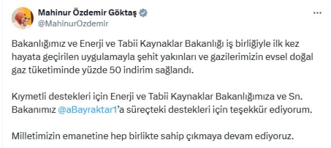 'MİLLETİMİZİN EMANETİNE SAHİP ÇIKMAYA DEVAM EDİYORUZ'Aile ve Sosyal Hizmetler Bakanı Mahinur Özdemir Göktaş, şehit yakını ve gazilerin doğal gazı evlerinde yüzde 50 indirimli kullanmalarına yönelik karara ilişkin sosyal medya hesabından açıklama yaptı. Bakan Göktaş, "Bakanlığımız ve Enerji ve Tabii Kaynaklar Bakanlığı iş birliğiyle ilk kez hayata geçirilen uygulamayla şehit yakınları ve gazilerimizin evsel doğal gaz tüketiminde yüzde 50 indirim sağlandı. Kıymetli destekleri için Enerji ve Tabii Kaynaklar Bakanlığımıza ve Sayın Bakanımız Alparslan Bayraktar'a süreçteki destekleri için teşekkür ediyorum. Milletimizin emanetine hep birlikte sahip çıkmaya devam ediyoruz" ifadelerini kullandı. (DHA)