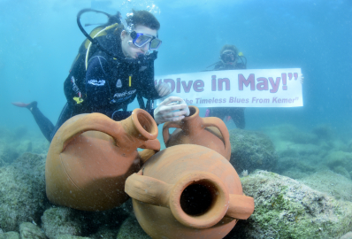 Su altına dalıp, taşa yazdıkları Hıdırellez dileklerini yapay amforalara bıraktılar