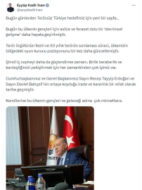 ANKARA, (DHA)- AK Parti Genel Sekreteri ve İzmir Milletvekili Eyyüp Kadir İnan, "Terör örgütünün feshi ve 50 yıllık terörün sonlaması süreci, ülkemizin bölgedeki oyun kurucu pozisyonunu bir kez daha güncellemiştir. Şimdi iç cepheyi daha da güçlendirme zamanı. Birlik beraberlik ve kardeşliğimizi pekiştirmek için her zamankinden çok işimiz var" dedi.AK Parti'li İnan, terör örgütü PKK'nın silah bırakma ve fesih kararıyla ilgili sosyal medya hesabından açıklama yaptı. İnan, "Bugün günlerden Terörsüz Türkiye hedefimiz için yeni bir sayfa. Bugün bu ülkenin gençleri için asilce ve feraset dolu bir 'devrimsel gelişme' daha hayata geçirilmiştir. Terör örgütünün feshi ve 50 yıllık terörün sonlaması süreci, ülkemizin bölgedeki oyun kurucu pozisyonunu bir kez daha güncellemiştir. Şimdi iç cepheyi daha da güçlendirme zamanı. Birlik beraberlik ve kardeşliğimizi pekiştirmek için her zamankinden çok işimiz var. Cumhurbaşkanımız ve Genel Başkanımız Sayın Recep Tayyip Erdoğan ve Sayın Devlet Bahçeli’nin ortaya koyduğu irade ve kararlılık bir milat olarak tarihe geçmiştir. Kendilerine bu ülkenin gençleri ve geleceği adına çok minnettarız" dedi. (DHA)